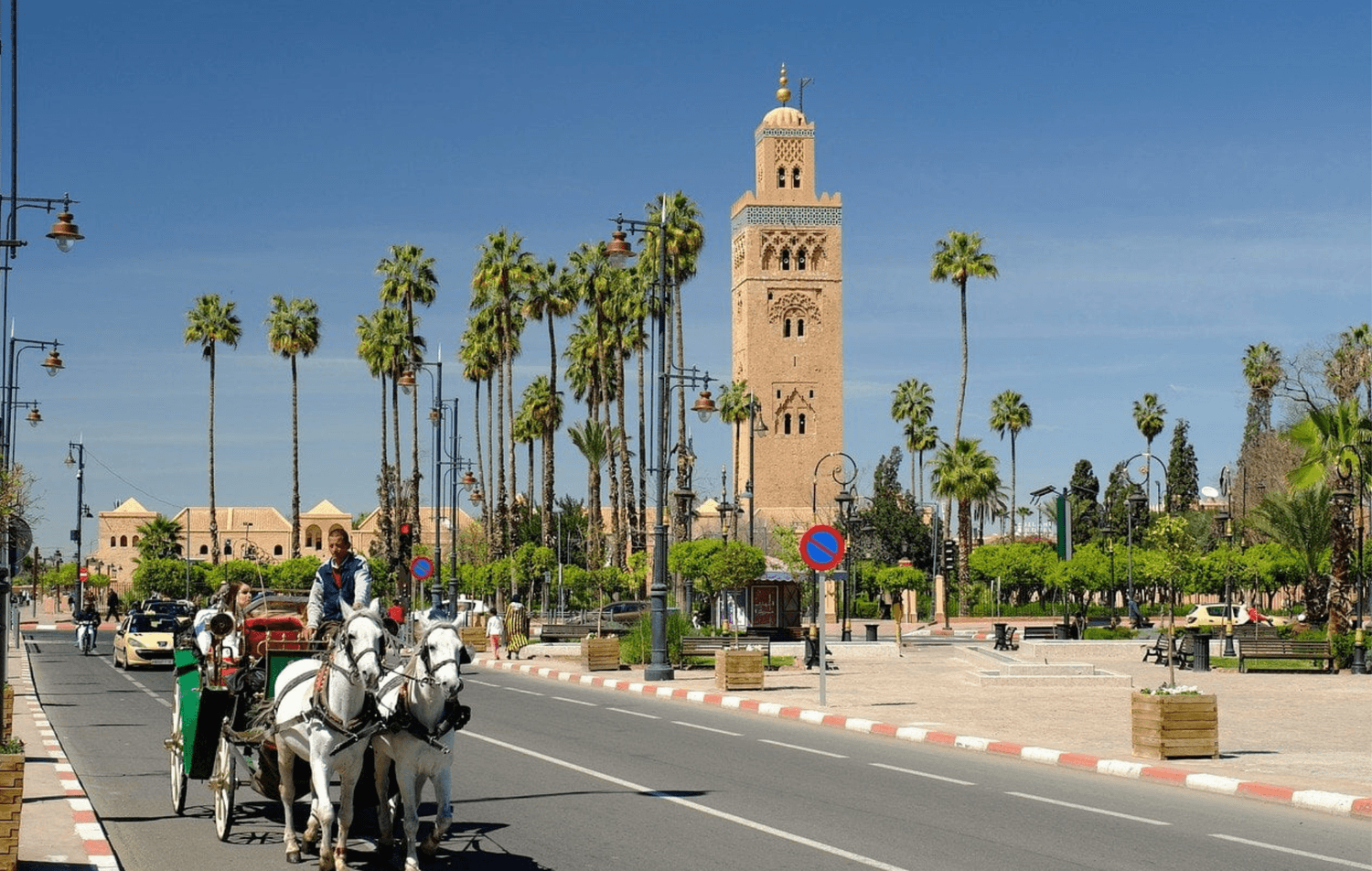 La majestueuse Mosquée Koutoubia, qui est la grande mosquée la plus connue de Marrakech, reconnaissable à son très haut minaret de 77 mètres, qui a servi de modèle pour la construction de la Giralda de Séville et de la Tour Hassan à Rabat.