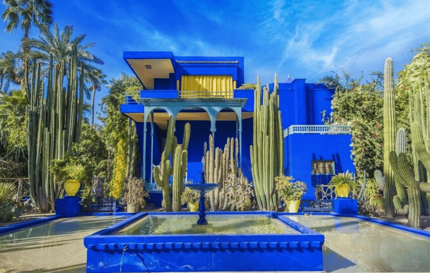 Le mythique Jardin Majorelle, connu pour son parc coloré où l’on se promène pour voir des plantes, des fontaines et des bâtiments bleu vif.